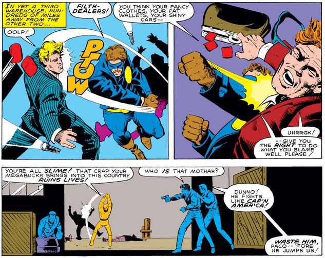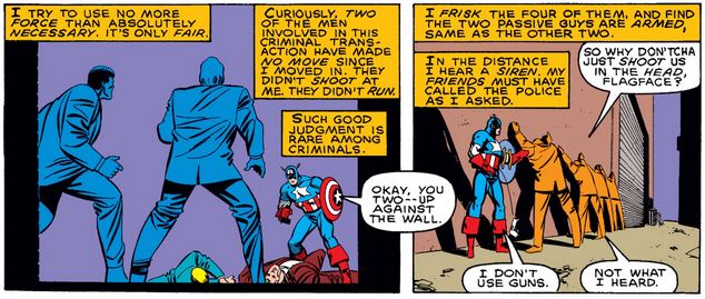 In issue #324, Cap bursts in on a quartet of armed men who turn out to much more afraid of him than they ought to be.