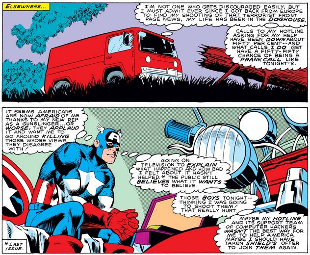 He reconsider SHIELD’s offer from the last issue but dismisses it once again, remembering his role as a national symbol, and then contemplates the unthinkable.
