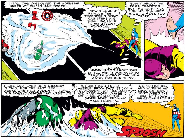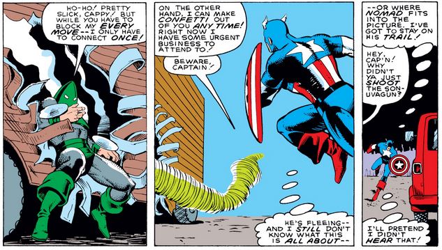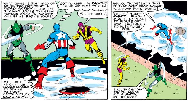Whirlwind’s answer is yet another reflection of the incident in Switzerland, but Cap doesn’t have time to ruminate on it… but the Trapster does confirm that the message from Nomad was a ruse (and a clever red herring on the part of writer Mark Gruenwald, given Nomad’s reappearance in this issue).