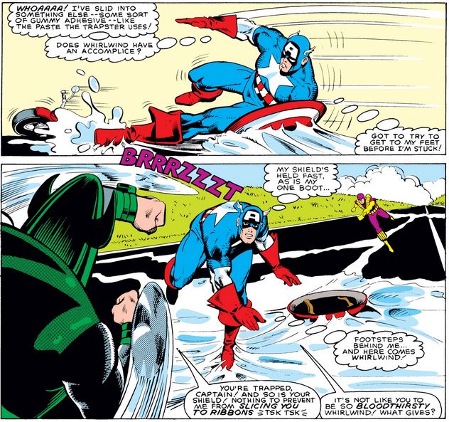 Eventually Whirlwind flees, leaving Cap clueless… and subject to a heckler.