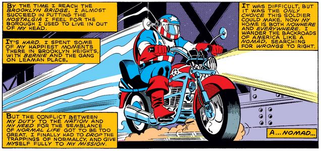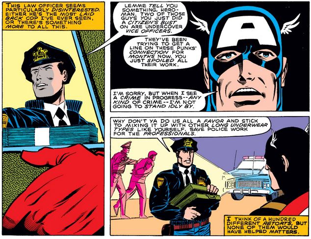 Momentously, below Cap puts an end to the experiment that began in issue #237 when he moved into 569 Leaman Place in Brooklyn (although he decided to move out in issue #317 after his break-up with Bernie Rosenthal). He declares the conflict between fulfilling his duty and maintaining a private life too difficult, and chooses the former, thinking of himself first and foremost as a soldier, which is very interesting, being rare in this period.