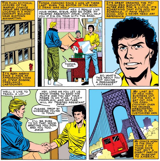 “Don” is Don Daley, editor of the in-universe Captain America book as well as ours, and “Dave” is David Wohl, his assistant. (And yes, Steve Rogers wears parachute pants—in the late 1980s, who didn’t?)
