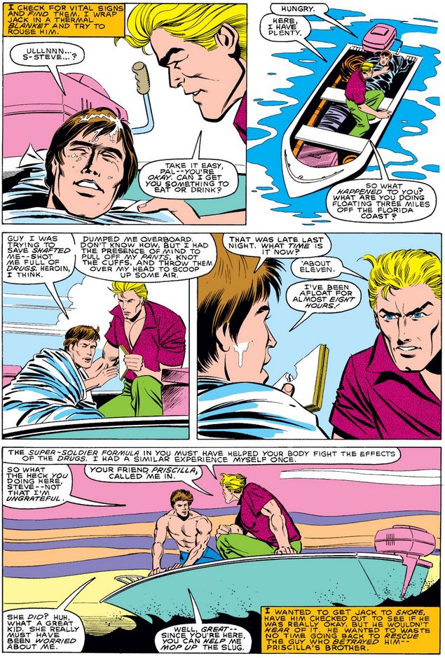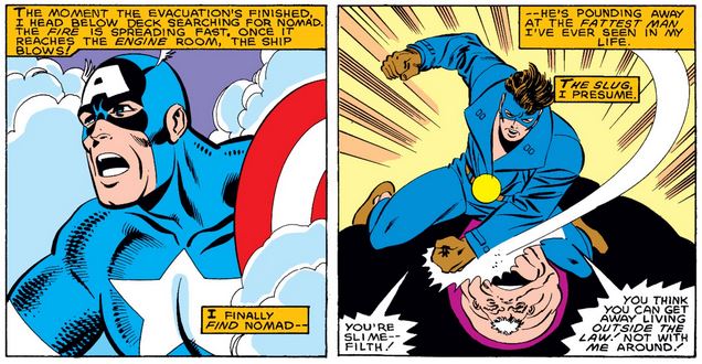 Before long the yacht finally explodes, after which Cap and Nomad reunite in the water, the Slug emerging soon afterwards (later to appear in a wide variety of Marvel titles, including Captain America and Nomad).