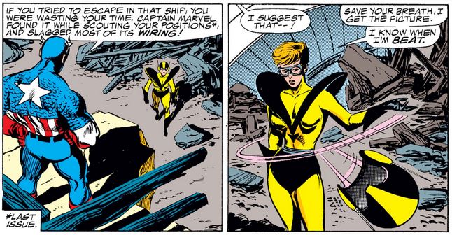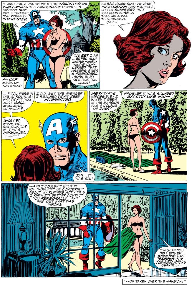 After sitting out the inaugural issue of the arc, in which Zemo and friends take over the Mansion, we finally see Cap in issue #274 as he literally drops in on the Wasp, who is enjoying some rare downtime beside her pool while she mulls her ethical responsibilities as team leader.