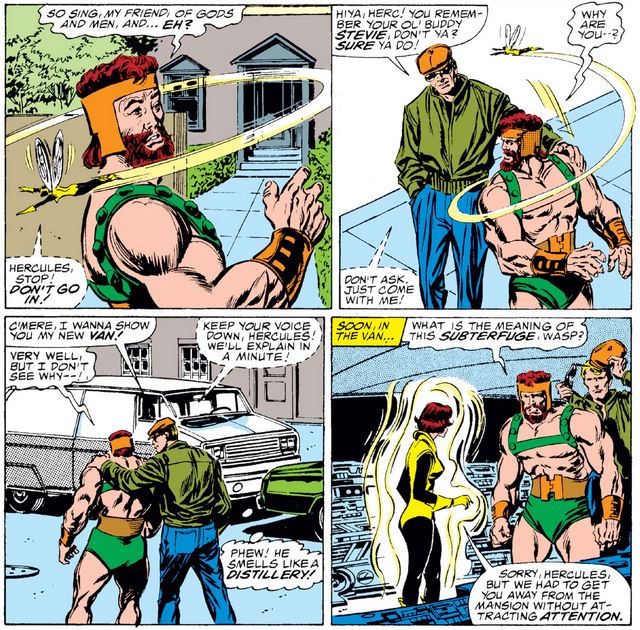 After the Wasp sneaks into the mansion and finds Jarvis and the Black Knight tied up, she and Cap try to intercept Hercules before he returns… rather under the influence… which makes it easier for his old friend “Stevie” to lure him into his van.