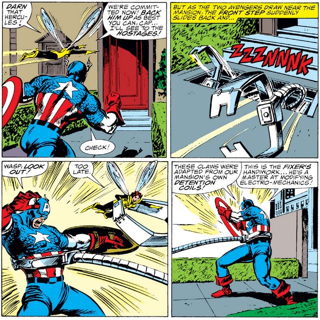 …before Hercules loses his temper and flees the van, headed toward the mansion, with Cap and the Wasp in close pursuit. Cap happily accepts a command from the team leader before the mansion’s own security systems, recently enhanced, get hold of him.