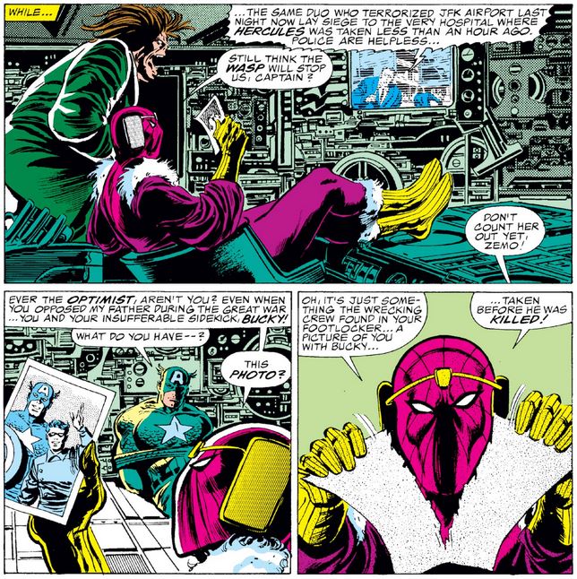 When Zemo and Hyde hear on the news that Titania and the Absorbing Man are going after Hercules and the Wasp in the hospital where the former is recovering from the thrashing he received in the last issue, they team-taunt Cap, this time adding a treasured memento for extra impact.