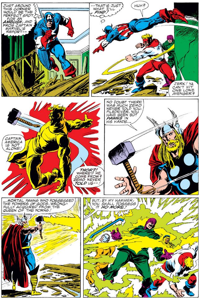 Cap easily thwarts the villains’ attempt at “ambush,” after which Thor deals them an apparently deadly blow…