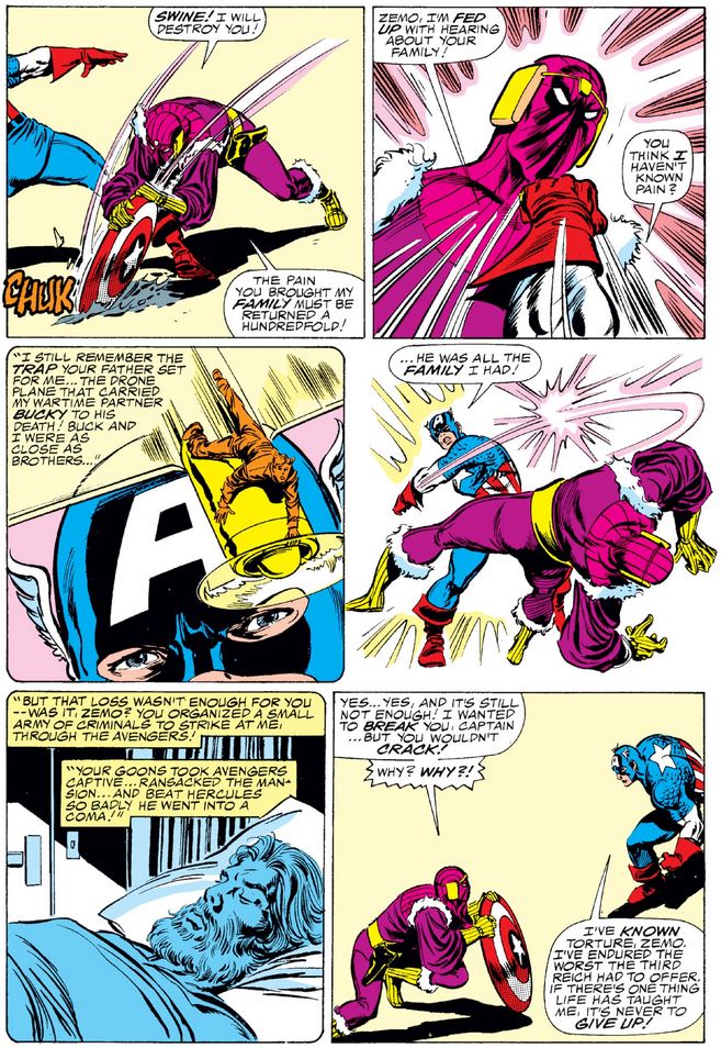 Next comes the “you’ll never get away with this” routine, but Zemo ignores it, and Cap turns to asking how he survived Mother Superior psychic blast in Captain America #299.