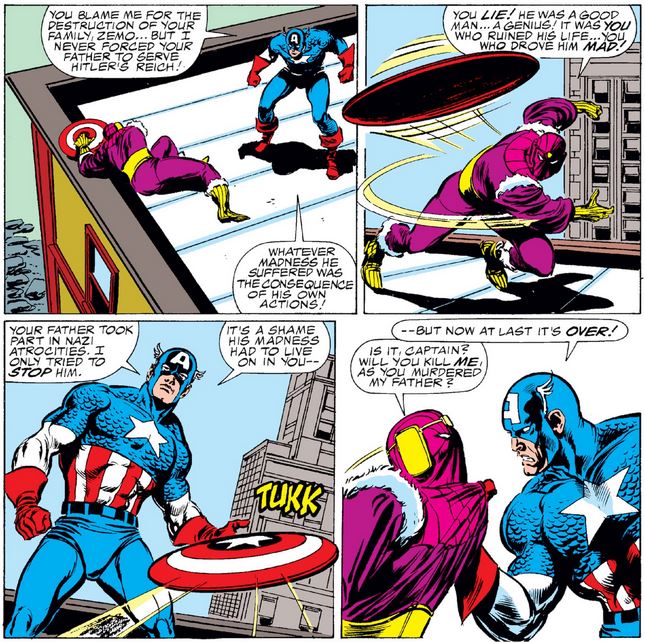 …as well as his own demise, despite the younger Zemo’s delusion. (Could Zemo also have been thinking about Cap’s controversial actions in Switzerland? We’ll never know!)