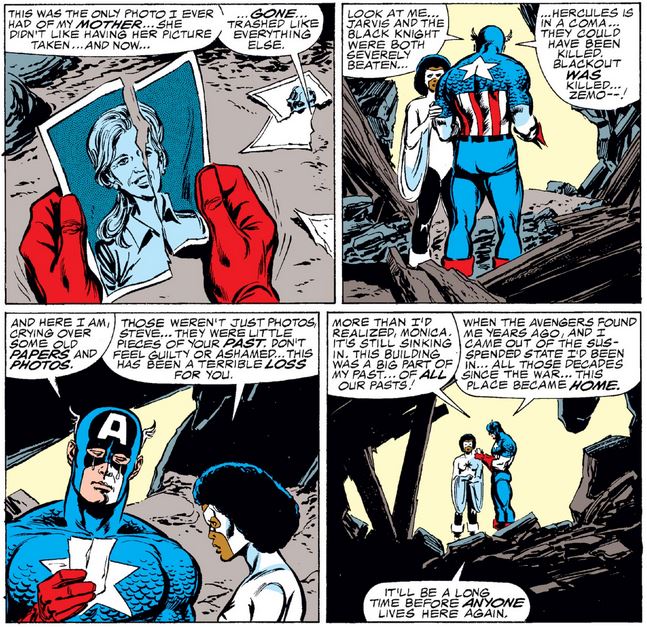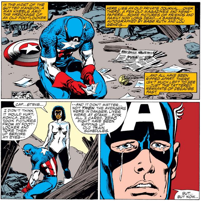 After Zemo is taken to the hospital, Cap surveys what little is left of the mansion and its contents, which he hadn’t had time to consider while fighting for his life and the lives of his teammates.