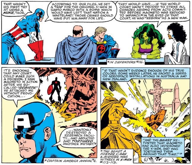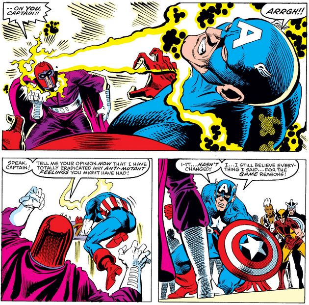 Magneto doesn’t like this answer, so he uses his helmet against Cap to cleanse his mind of anti-mutant prejudice…