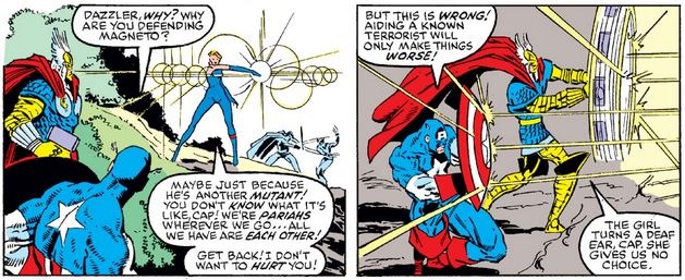 The Avengers find Magneto—reunited with his fancy helmet, as seen on the cover—and after a bit of fighting the X-Men show up to join the fun (after all, the book is not titled Magneto Vs. Avengers). Cap asks Dazzler why they’re defending Magneto, and she refers to mutant solidarity, while Cap points out that Magneto is not just another mutant.