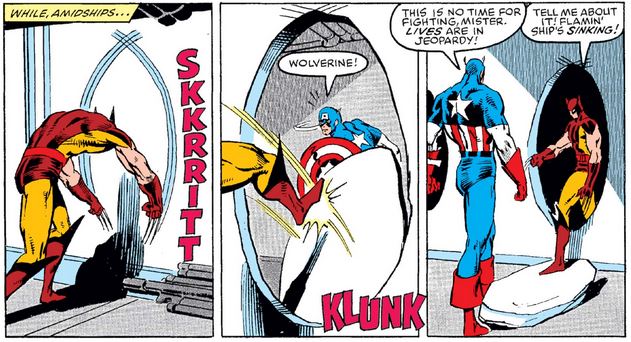 In the third issue, the Avengers track the X-Men to Singapore, where the mutants are fighting the Soviet Super-Soldiers aboard a Dutch freighter that was definitely not built for it. As for the epic Captain America-Wolverine fight shown on the cover… here is their one and only scene together in the issue: