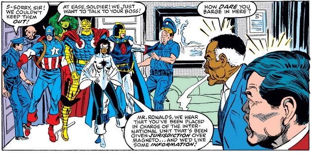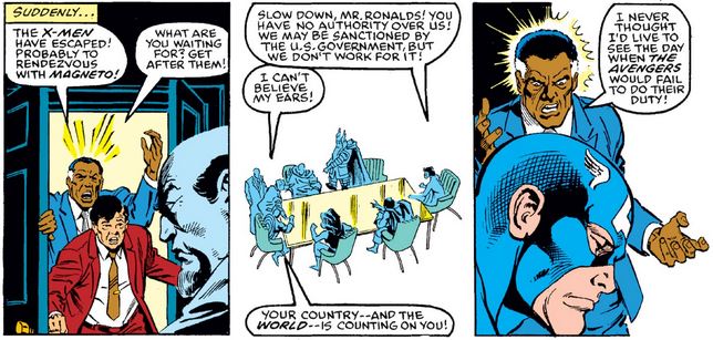 The g-men burst in to announce that the X-Men removed themselves from custody, and order the Avengers to find them (again). Captain Marvel hesitates, but Mr. Ronalds aims his disappointment at the other Cap, knowing full well that his buttons will be easier to push.