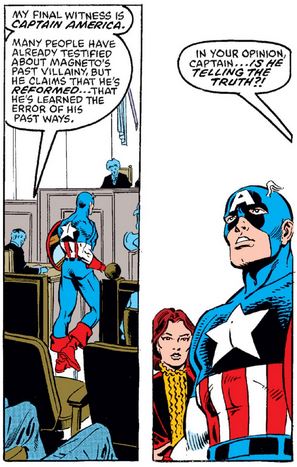 Defense counsel naturally objects to Cap giving testimony, presumably on the grounds that he is a “masked vigilante,” but come on… it’s Captain America, not Spider-Man. And his response is to the point and not in Magneto’s favor, which is somewhat disheartening given Cap’s recent interactions with him.