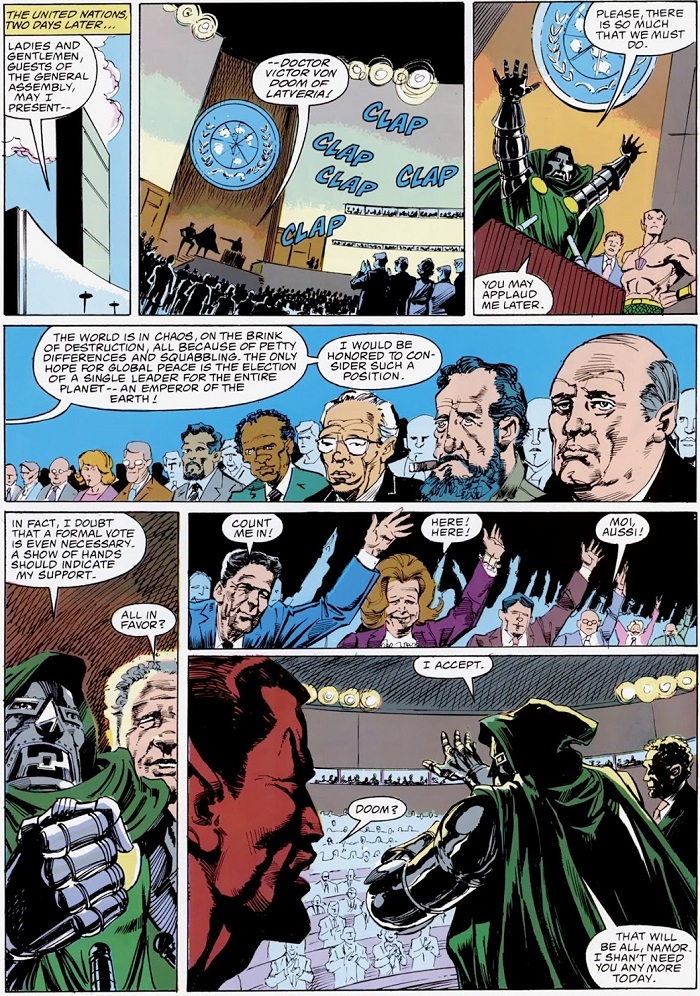 In the first third of the graphic novel, Doctor Doom establishes and carries out his plan for world domination and salvation, based on capturing the Purple Man and using a “psycho-prism” to magnify his mind control abilities to cover the entire globe. He uses a smaller version to take control of Namor, and is careful to take out any other heroes whose unique brains are resistant to the Purple Man’s power, such as the Vision. Once everything is in place and the people of the world are under his mental command, Doom visits the United Nations and gets unanimous support (from many familiar faces of 1987 politics) to become ruler of the Earth.
