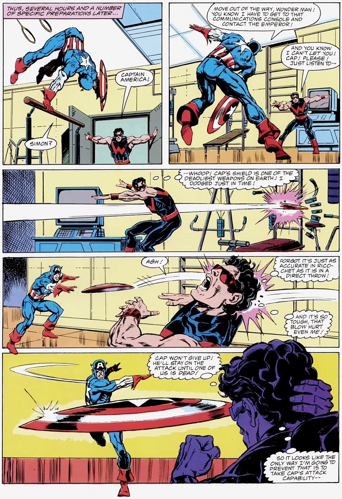Simon catches Cap’s shield and returns it, hoping to trick Cap into dodging it in the direction of Simon’s fist… which actually works? (I know, Cap isn’t himself… that has to be it. it has to be!)