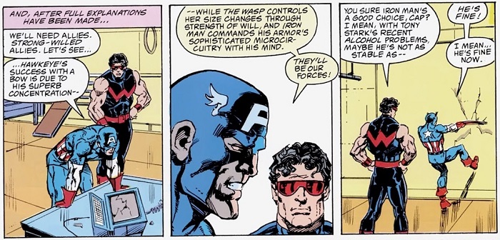 After Cap has calmed down and installed an ad-blocker, he and Simon think of who else among their number have strong wills. Cap very generally cites Hawkeye first, then the Wasp, and finally Iron Man, and when Simon is skeptical of Tony, Cap stands up for him… sort of.