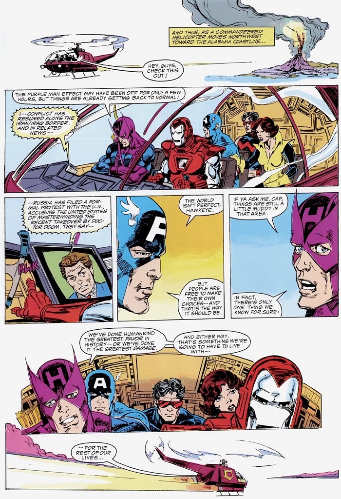 As the team leaves Doom Island, they hear news reports of the return of the usual political strife and violence, and while Cap sticks to his guns regarding the primary importance of freedom of choice, Hawkeye is more agnostic, sounding almost wise. (He’s clearly not himself either, but you can’t blame Doom anymore!)