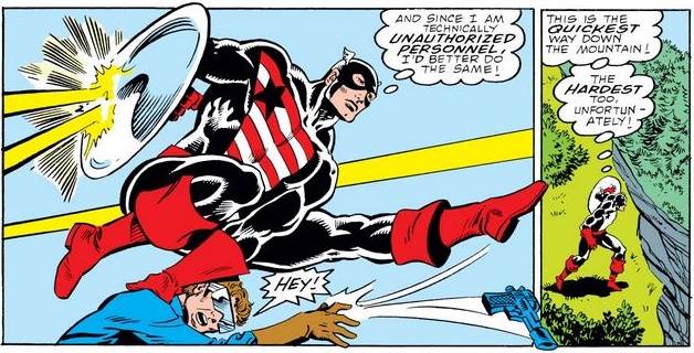 This issue follows directly from Iron Man #228, in which the Captain and Iron Man fought about Tony’s attempts to get his tech back from the U.S. government—specifically, breaking into the Vault, a prison for superhuman convicts, to disable the Stark-designed armor of their Guardsmen. For all his claims to be a futurist, Tony either didn’t foresee that his disabling of the security system in the vault was going to open the door (literally) for the inmates to escape, or he didn’t care—we’ll find out more from the Iron Man himself in the next issue.
