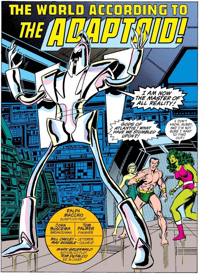 After the Super-Adaptoid traps the Avengers in cubes (cosmic power sold separately), banishes Kubik to a black hole in another galaxy, and adopts a more typical humanoid look, he announces his plan to spawn a countless number of adaptoids that can replace humans, proclaiming himself the Supreme Adaptoid (because I guess we can just do that now).