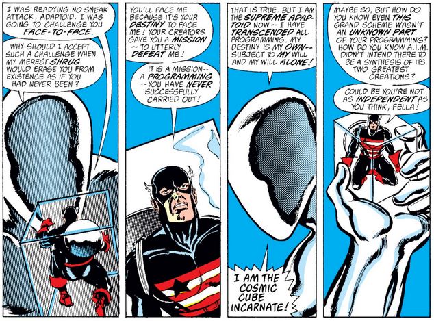 Cap apparently tries to goad the Adaptoid into a fight by questioning his newfound free will, hoping he’ll follow his original programming instead… out of anger, I guess? This is some 12-dimensional reverse psychology here, folks.