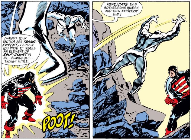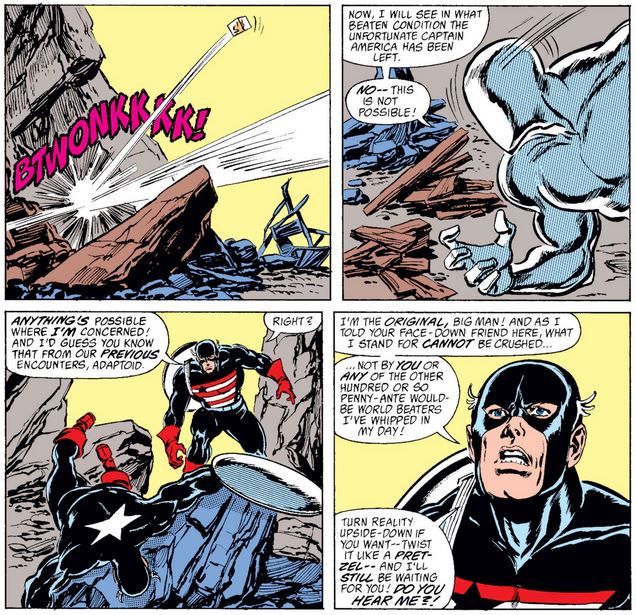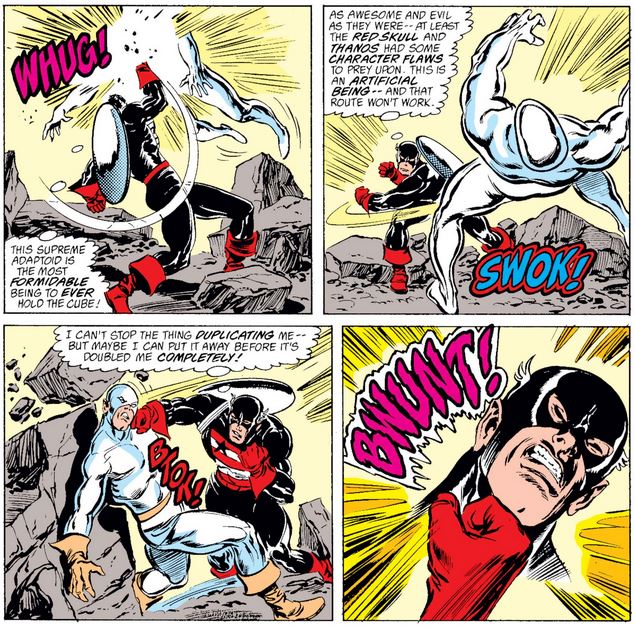 Cap fights the mini-Adaptoid while it tries to replicate him, and realizes why his gambit may not have worked: The Supreme Adaptoid has no “personality” to speak of and therefore no character flaws to exploit. (Well, there’s vanity, but he already tried that above, maybe kinda.)