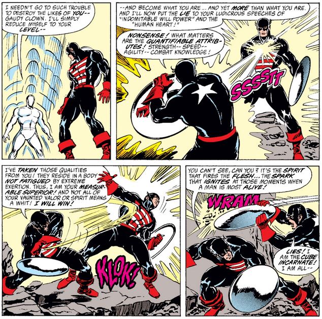 …and that, finally, is enough to get the Supreme Adaptoid to fight Cap on roughly equal terms. (Maybe Cap was actually playing 13-dimensional reverse psychology the whole time!) The Adaptoid argues that all that matters can in fact be measured (contradicting common wisdom), treating his battle with Cap like a role-playing game…