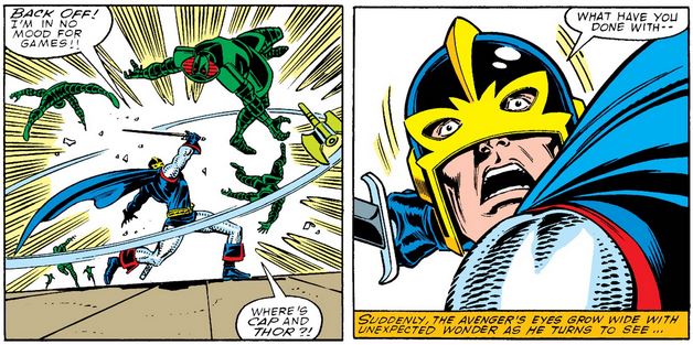 What’s the fuss, Gus? Turns out… nothing at all, other than returning from a battle with the Celestials, which had the pleasant result of healing the wounds he had the last time we saw him and restored his old costume. Like so many others, he does not recognizing the Man in Black; Cap does not seem to take this well, and challenges the Asgardian to hurl the mighty hammer Mjolnir at him. Thor does not hesitate to do this, confirming his old friend’s identity without even having to ask for his mother’s maiden name (which has never been revealed, I believe—impressive cybersecurity on Cap’s part!).