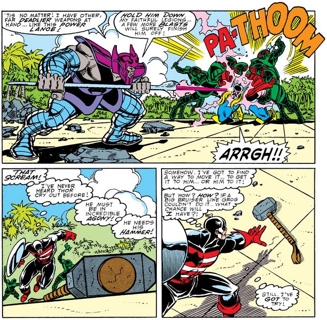 Finally, the moment we’ve been waiting for: As Thor is subdued by Gogg, Cap sees Mjolnir lying nearby. He watched earlier as Gogg tried in vain to lift it, so he wonders how he can possibly do it—perhaps being unaware of its inscription, reflecting Odin’s enchantment demanding that one be worthy in order to lift the mighty Uru hammer.