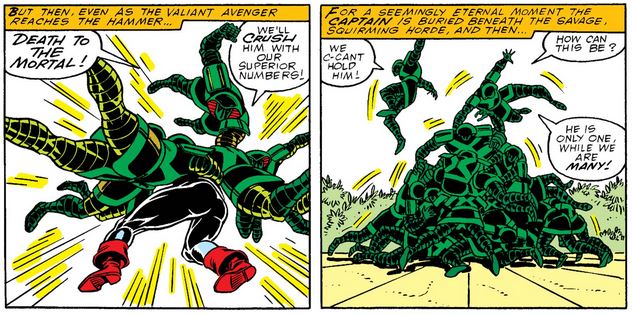 Apparently Gogg’s forces are rugby fans, forming a ruck on top of the Captain and making it very difficult for him to lift anything, much less Mjolnir!