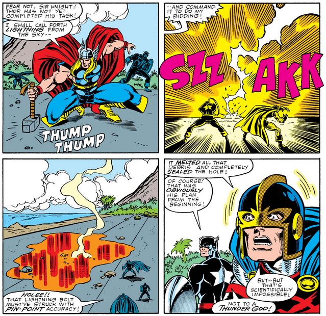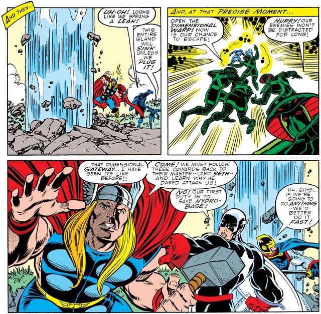 Before Thor can break more rocks, though, an invasion force led by Grog the God Crusher—not to be confused with Gorr the God Butcher, from the recent Thor saga by Jason Aaron and Esad Ribić—appears on Hydrobase, sent by Seth the Serpent God of Death to defeat Thor the God of Thunder. (Enough with these titles, geez.) The Black Knight, who is still on the island too, hears the call of battle, but wonders where the other two fellas are…