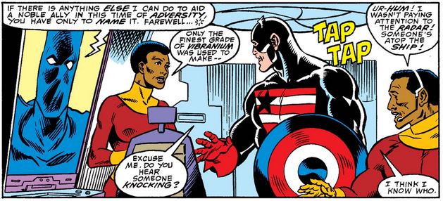 It turns out Cap was expecting the visitors… whose names, not to mention their “liege,” should give a clue as to where they’re from. (Please, no “Amazon” jokes based on the package K’Bali is “delivering” to Cap.)