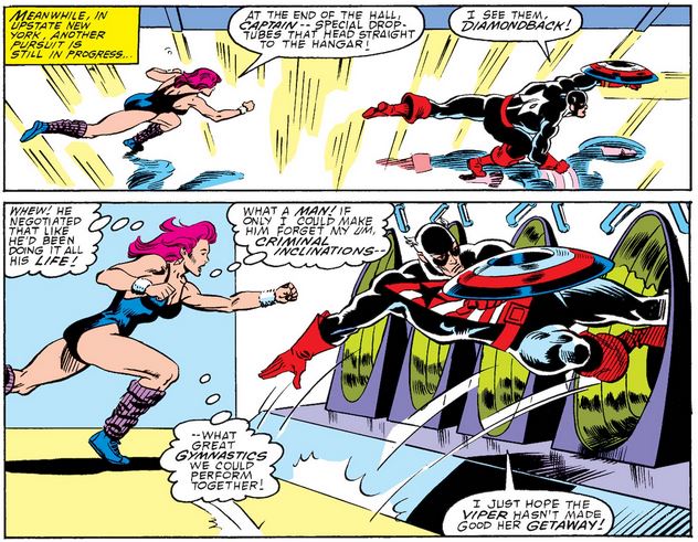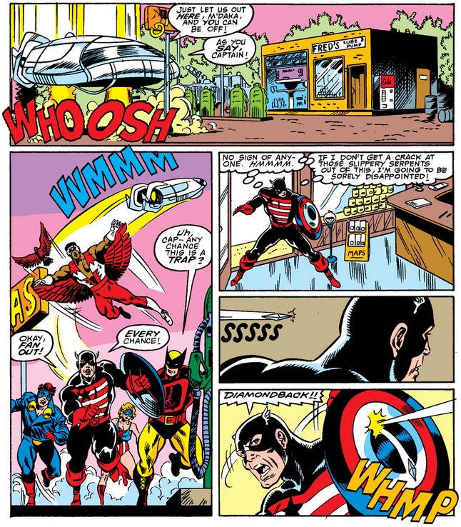 Diamondback lets Cap know to meet her and Society leader Sidewinder (whom Cap tangled with in issue #338) at Fred’s Lube & Pump in upstate New York, and while Cap is fully aware it may be a trap, I’m sure he didn’t expect confirmation so soon… much less from Diamondback herself.