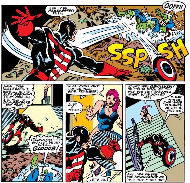 After they sneak in to the building, the rest of the group tussles with various Serpents, including D-Man and Diamondback struggling with Anaconda, while Cap searches for the captive ones who refuse to side with Viper, displaying a Gruenwaldian memory for D-list villains.