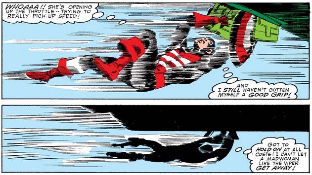 Viper tries to shake him off by speeding up, but she should know that Cap can do this all day.