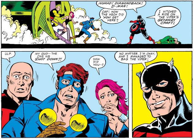 Cap defeats Viper in time for his pals to land right next to him, and he’s not even mad that they shot him out of the sky. (What a guy!)