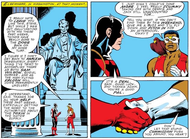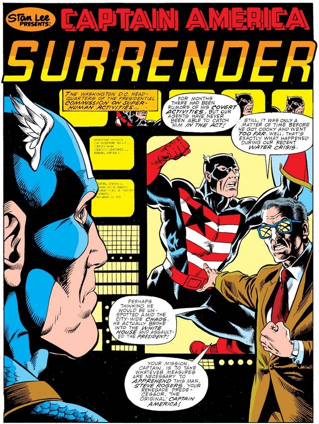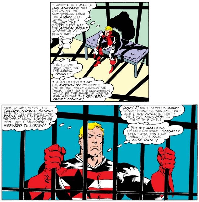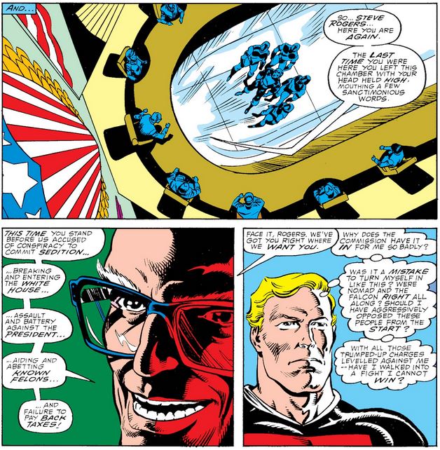 Cap regrets his passive response to the Commission, but again makes the mistake—as he did with Bernie Rosenthal in issue #336 and with Sam in issue #337—of conflating legal resistance to official orders with “waging war with the government.” He beats himself up over why he failed to see the problems with the Commission’s behavior earlier, especially after so many friends tried to tell him, but the easy answer seems to be his default respect for authority that somehow survived the Secret Empire incident—not to mention all his interactions with Gyrich!