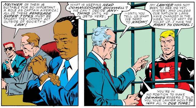“There oughta be a law,” Gyrich continues, while Rockwell is busy trying to deny Cap one of his Sixth Amendment rights (although I’m not sure it applies in the current extralegal context).