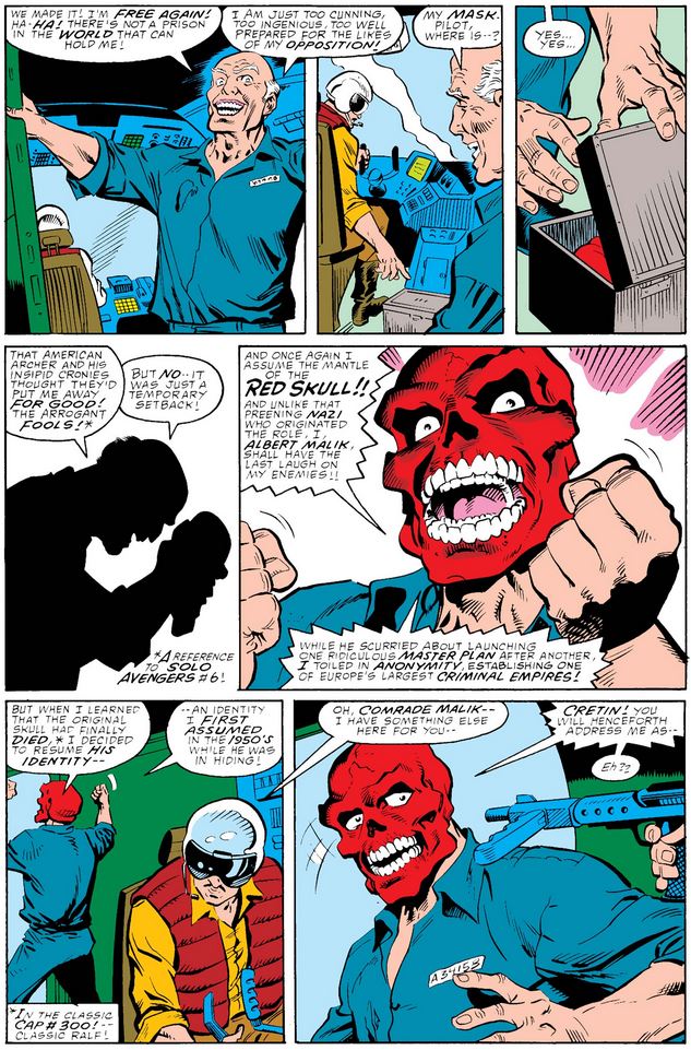 Why this fella elegantly smoking a cigarette in a holder, very interested in Steve Rogers and Captain America, and laughing maniacally while bathed in red light cares about eliminating a former Red Skull, I certainty have no idea!