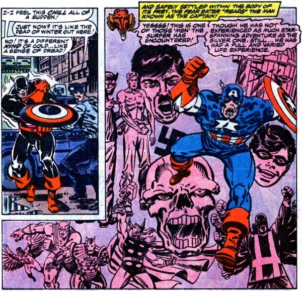 …arousing feelings the Fear-Eater uses to bring up and magnify Cap’s memories of being frozen for years between World War II and being rescued by the Avengers. (I guess the Fear-Eater likes his fears cold, like a nice cool pasta salad in the summer.)