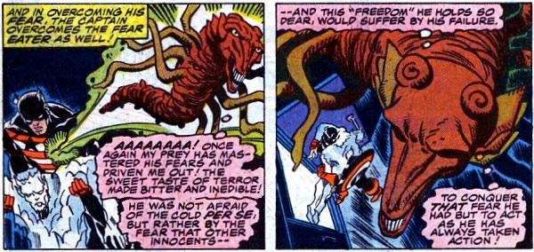The Fear-Eater is impressed that Cap does not fear death, and in fact has “mastered” his fears, which could be interpreted as meaning he still has them but doesn’t let them control him, which makes the Fear-Eater want to find them all the more—and he finds one particularly tasty one.