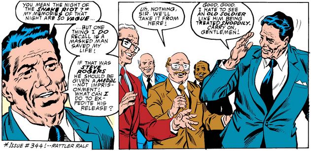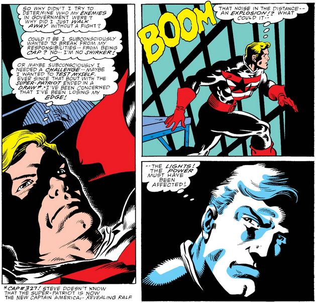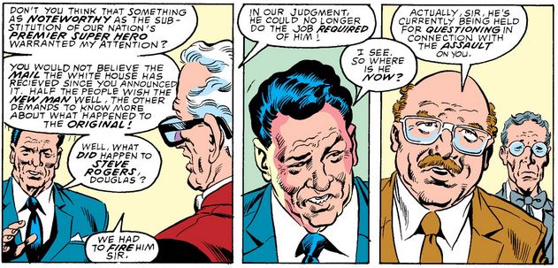 In Captain America #348, John Walker faces the Commission in a similar context to when Steve Rogers did the same in issue #332—with Mr. Rockwell even referencing why they replaced Rogers in the first place—ending with Walker being put in a time-out.