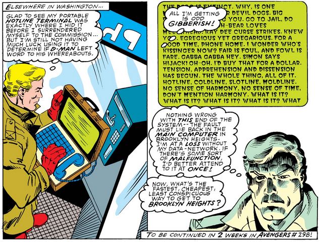 …which leads directly to Avengers #298 (without waiting two weeks, lucky you!). This issue is a tie-in to Inferno, an X-Men crossover event in which the Avengers were not really involved, but they were affected by its chaos for three issues. In this issue, as the cover indicates, the Avengers’ butler Jarvis is “the last Avenger,” battling sentient machines to protect a young woman named Glory Garsen. He manages to leave a message for Cap—but for some reason, Rorschach finds it instead.