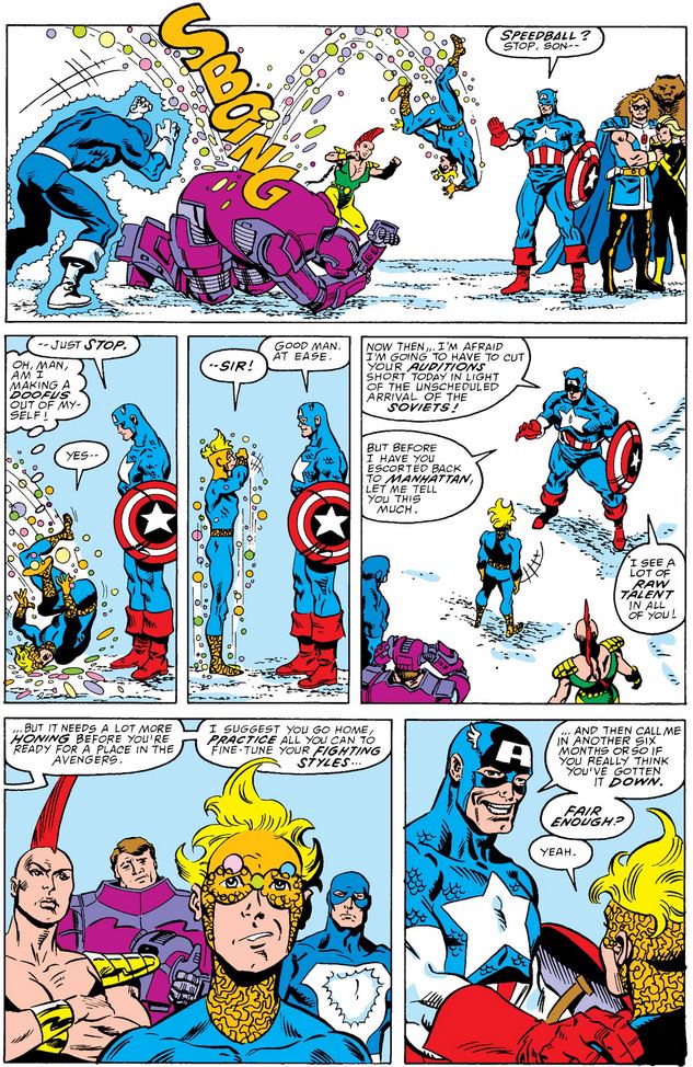 Before he can deal with the Soviet Super-Soldiers, Cap has to dismiss the Wannabe Avengers, which he does with an even balance of straight talk and encouragement.