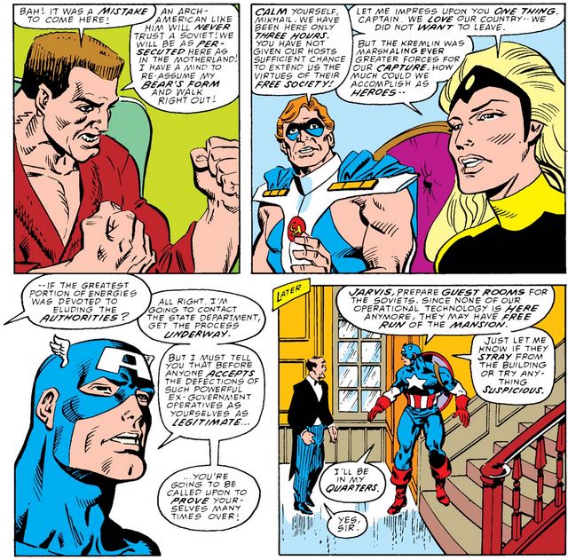 They also make clear, as Cap did repeatedly during his own recent exile, that their issue is with their government, not their country and the people of it. This must make Cap more sympathetic to their cause, but he still takes a prudently cautious attitude toward their visit, as we see in his instructions to Jarvis.