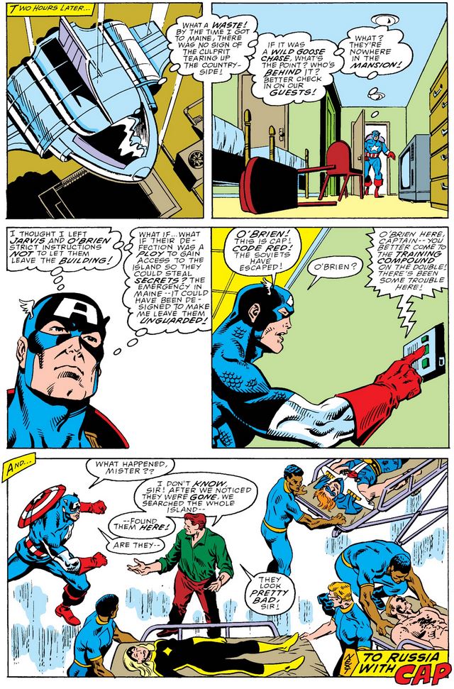 It takes a hot shower for Cap to admit to himself what we all know, that his reason for this visit was not only to improve relations between the Avengers and the USSR, but also to investigate his suspicions that the forces who defeated the Soviet Super-Soldiers came from their own country (a natural suspicion, given that they were defecting), especially given how powerful those forces must have been.