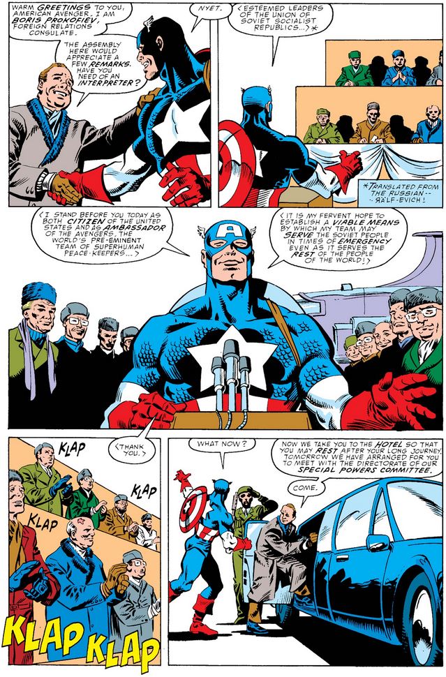 Cap is fluent in Russian… who knew? He takes this opportunity to promote the Avengers as a global superhero team, not only for the west any more.