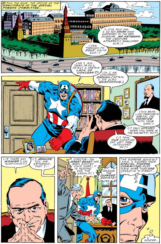 After the creature reappears, both Cap and Red Guardian fight it until it absorbs the Soviet hero and then disappears again. Cap wants answers and heads to the source to get them, but finds himself the target of suspicion. (He seems to have much less reticence about angrily confronting government officials after his recent experience with the Commission!)